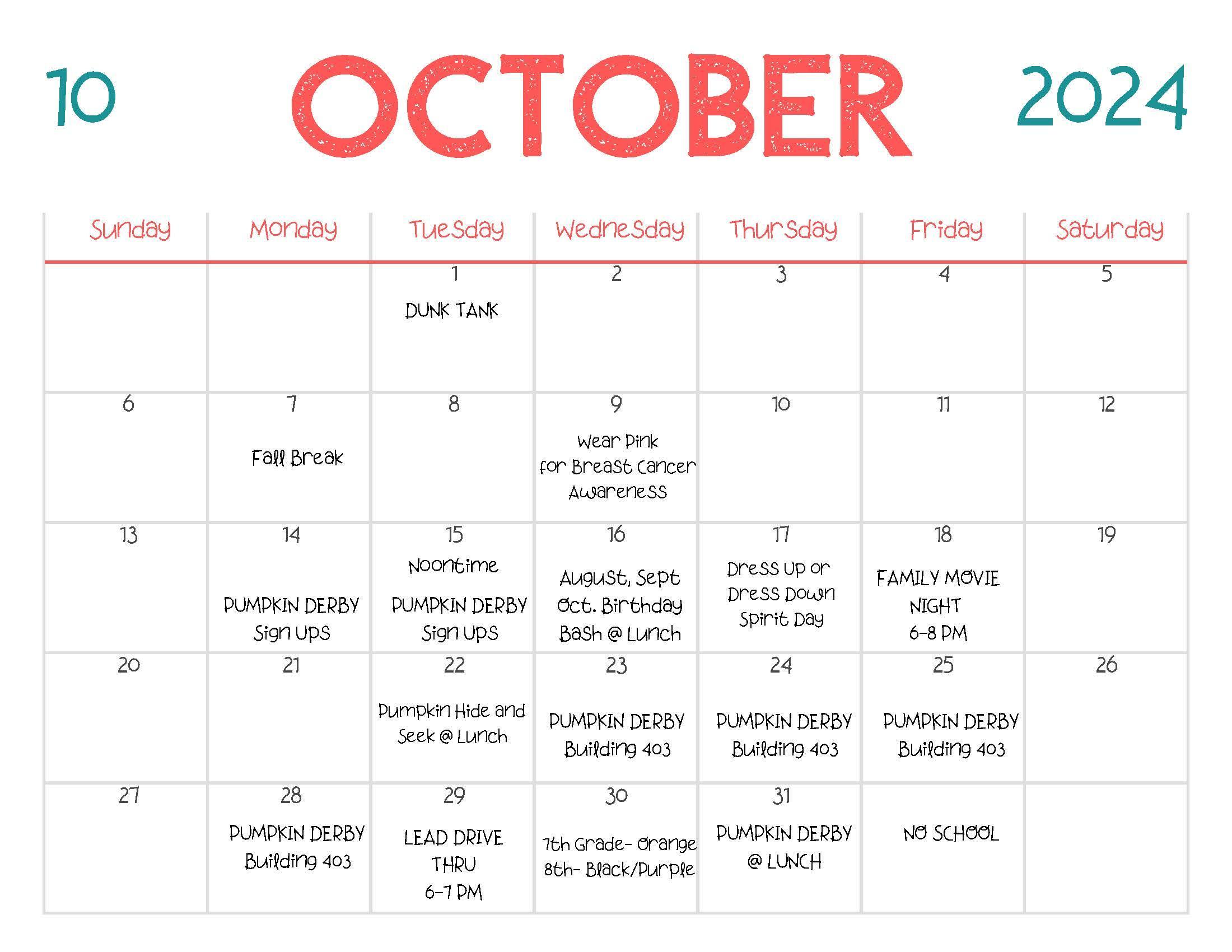 October ASB Calendar Arroyo Seco Junior High